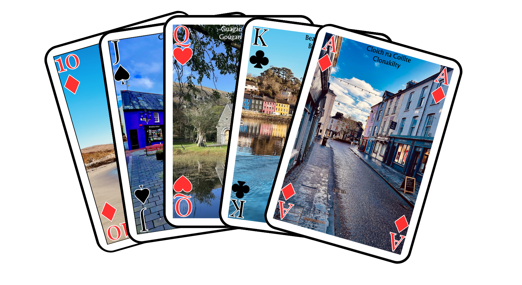 A beautifully designed unique deck featuring 54 photographs of West Cork’s landscapes, towns and coastline — perfect for games, gifts and collectors. All locations shown in Irish and English. All photograph and design work undertaken by our West Cork based company.
